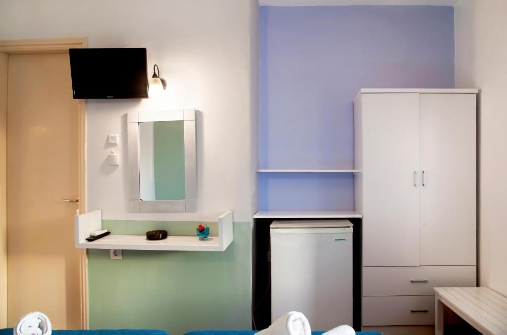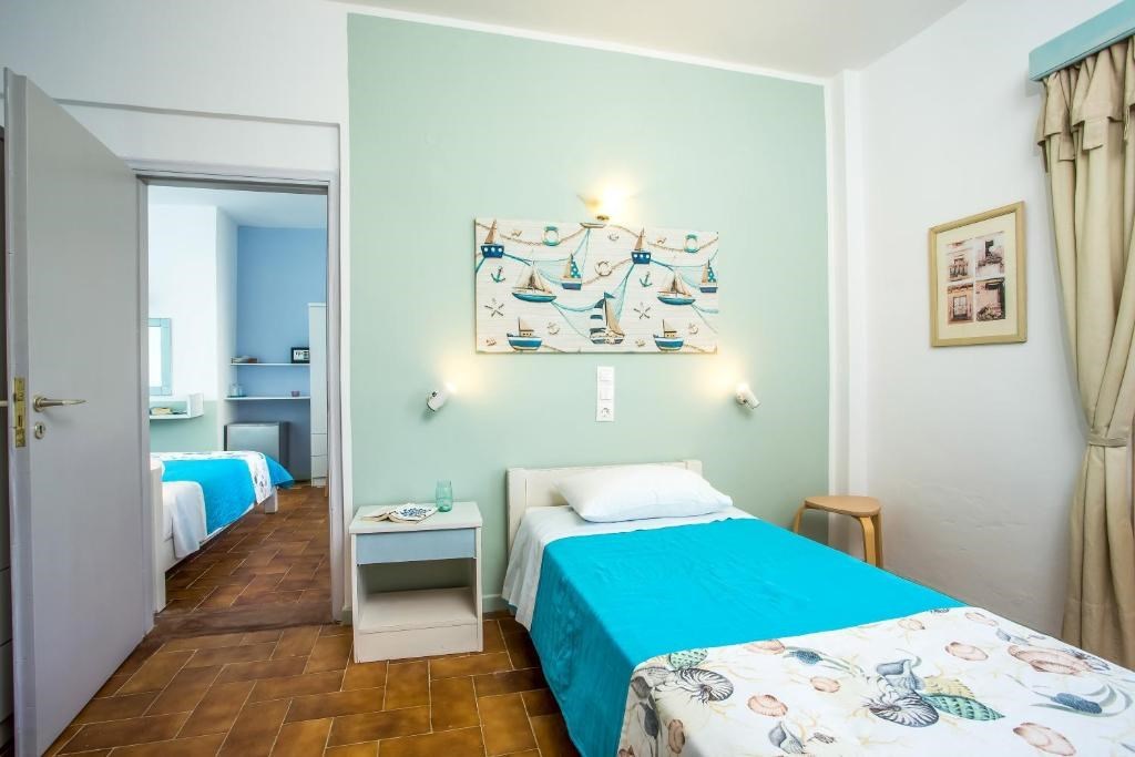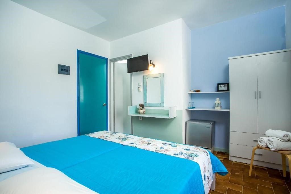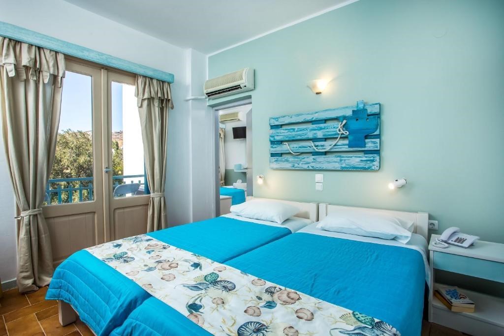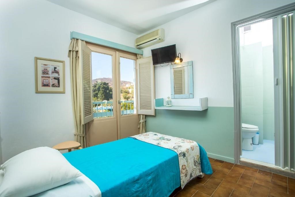 Ideal for friends or small families, our spacious 35 m² Triple Bedroom features three comfortable single beds and a private balcony with sweeping views of the sea, mountains, and the charming landscape of Leros. Enjoy modern comforts including air conditioning, a flat-screen TV, a private bathroom, and a peaceful atmosphere perfect for relaxing after a day of island adventures